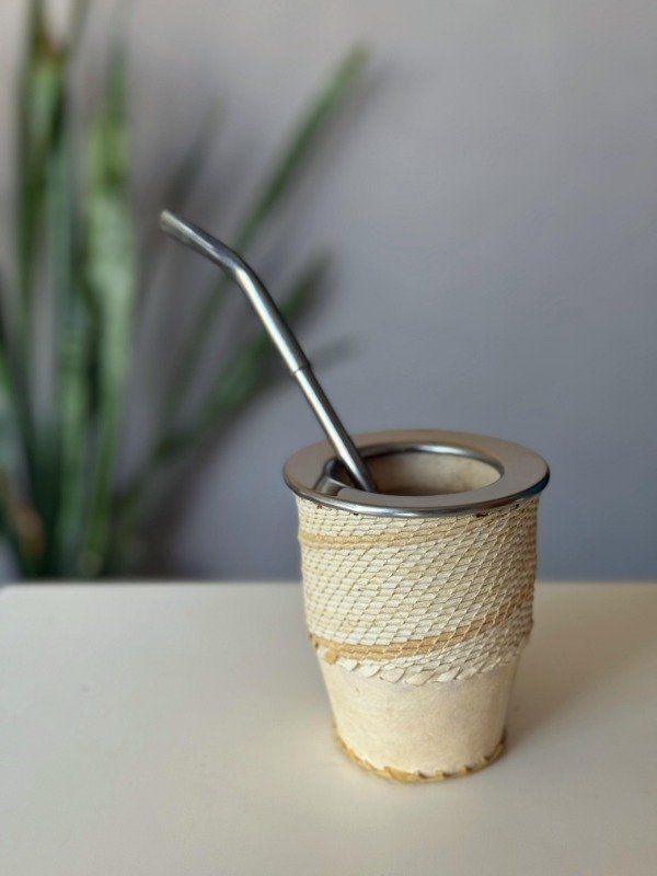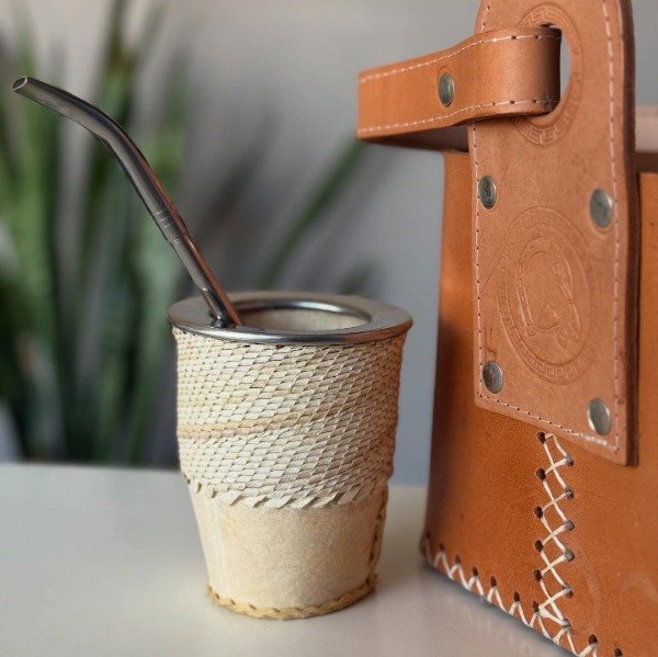 Mate camionero tejido con virola de acero, su interior es de calabaza